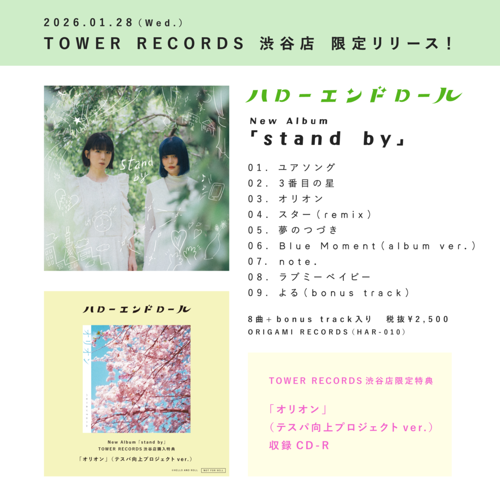 本日、1月28日TOWER RECORDS 渋谷店にて、ハローエンドロール new album「stand by」が販売開始しました!